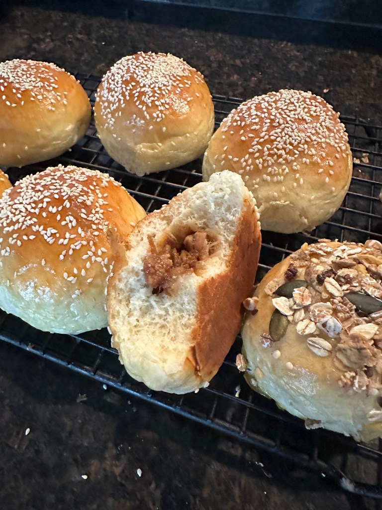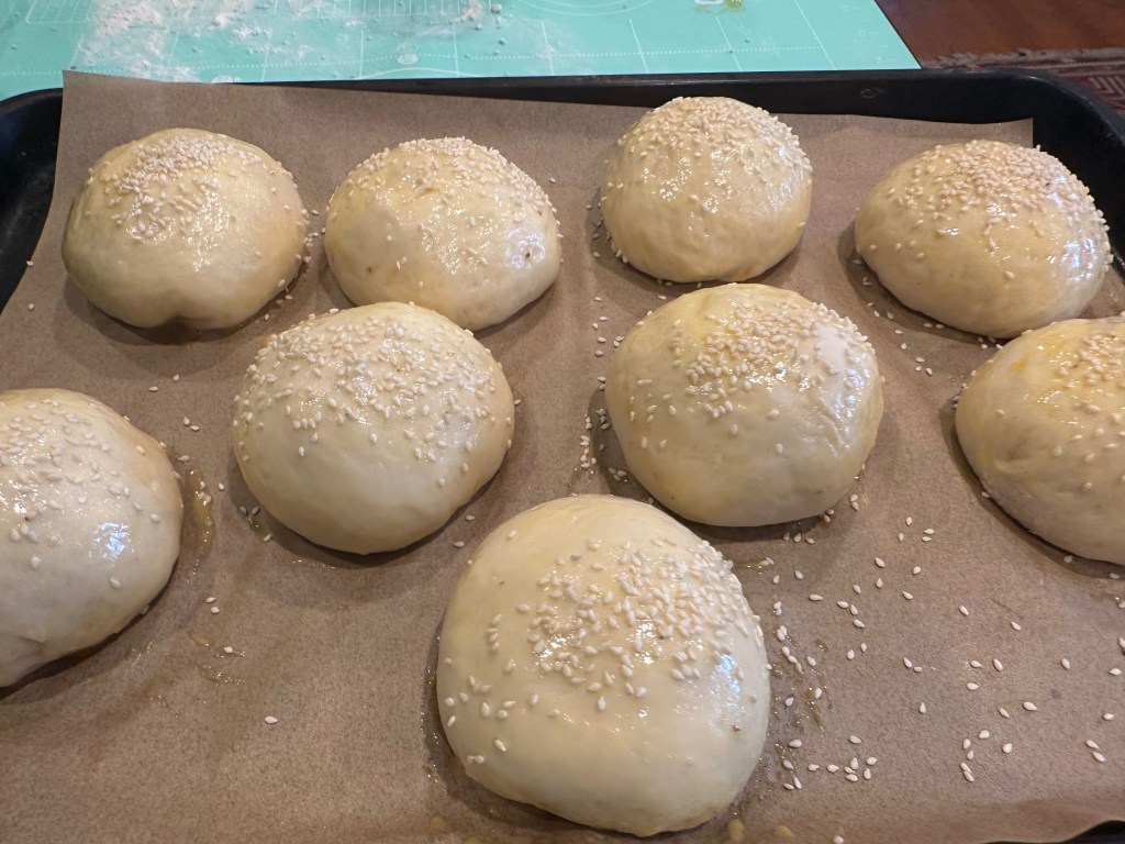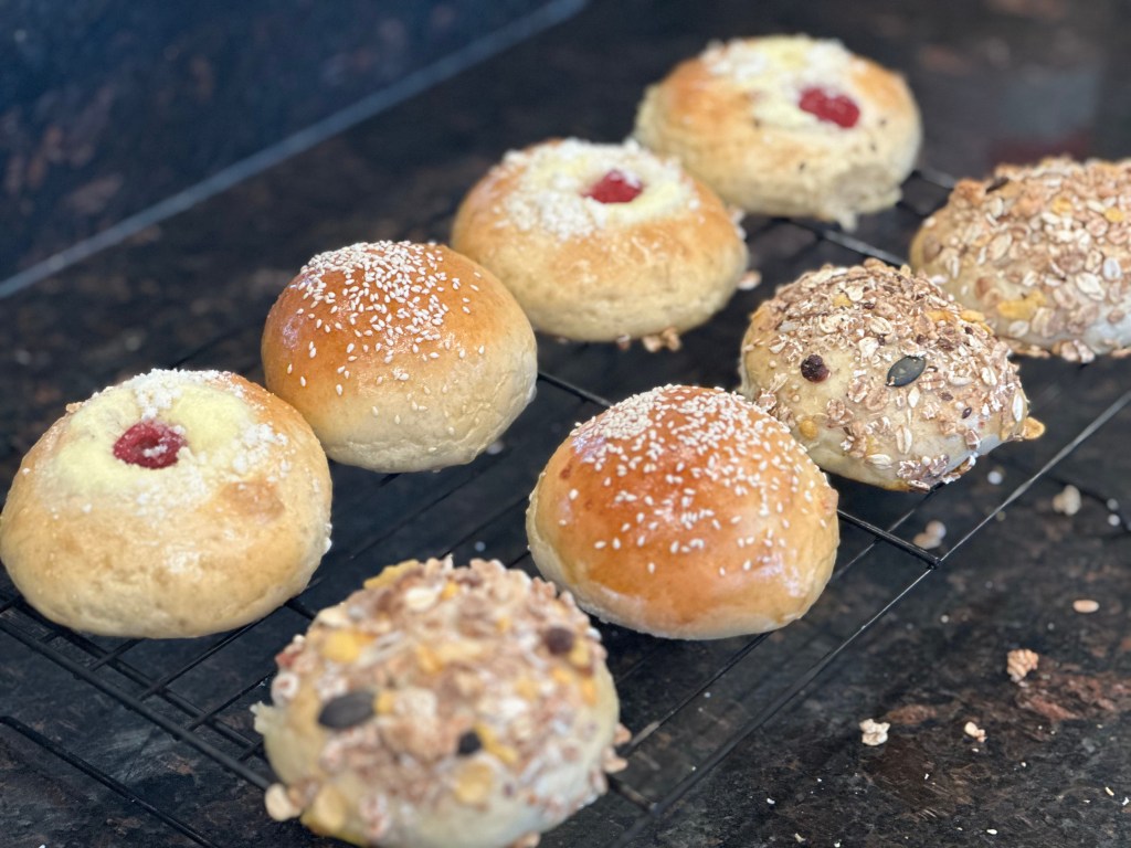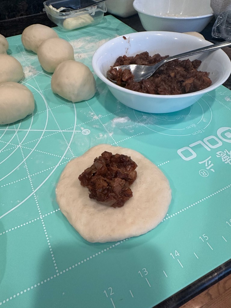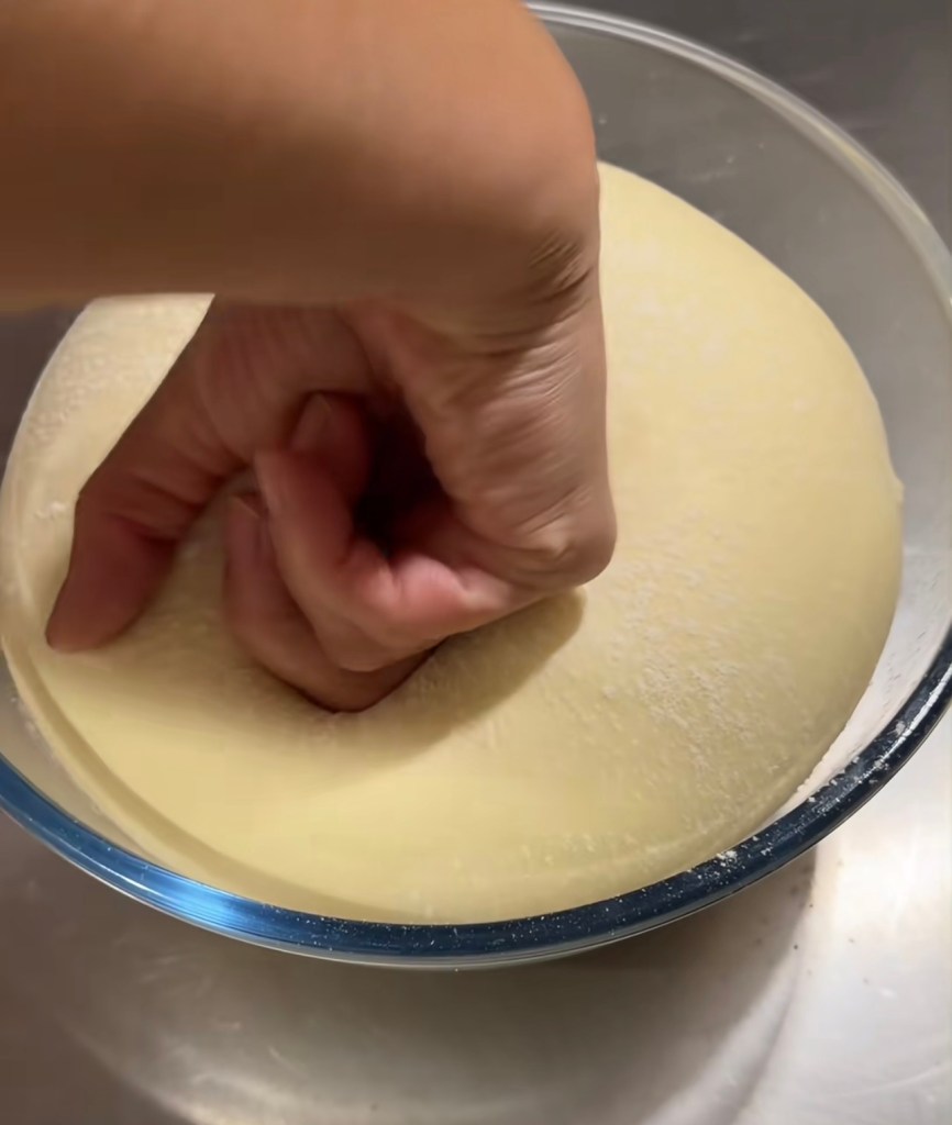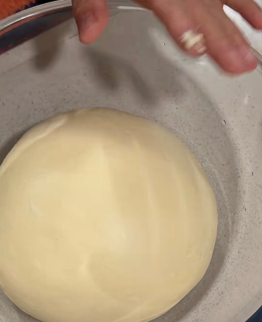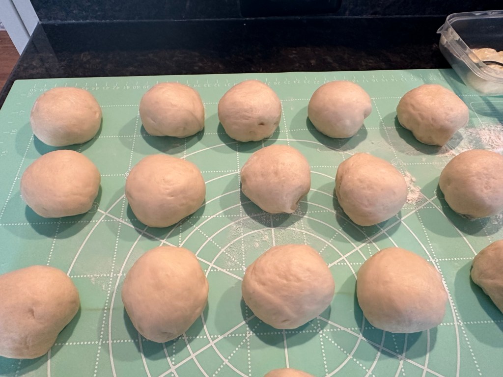 5. the 1st shape – lightly dust the countertop. Pick a dough piece. Flatten the dough. Flip the dough (with smooth side facing down). Use a rolling pin to make it longer. Roll it up. Rest for another 15 mins.