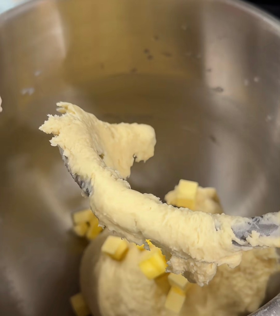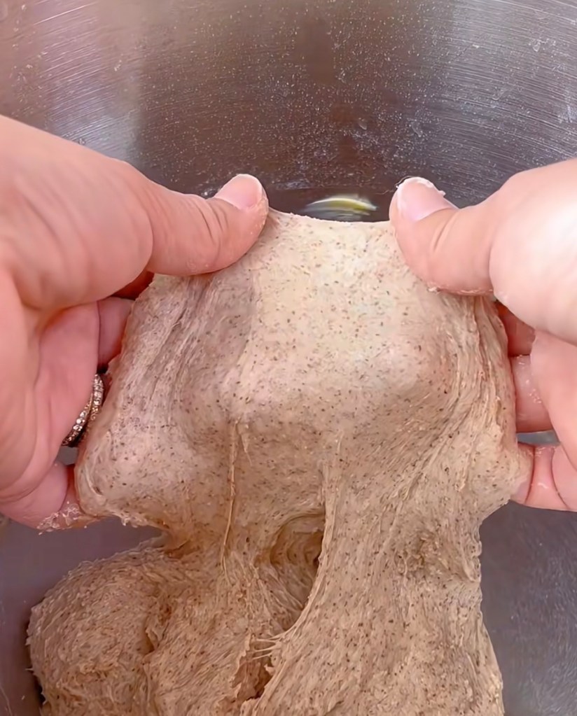 2. Mix 200g bread flour, 2/3 tsp salt. 20g sugar, 20g honey, 1 egg, 60g milk and the 200g starter in the bowl of a stand mixer. Speed 3 till it comes together. then move to speed 5 till 70-80% gluten developed. Add 20g butter and 1 tsp salt. Use speed 3 for 2-3 minutes. Then move to Speed 5-6 till window pane created. But do not over do it. 80-90% gluten developed is fine. If overdoing it, you will risk of breaking the gluten as there are about 30% wholemeal in the dough which are more fragile than the strong whole bread flour dough.