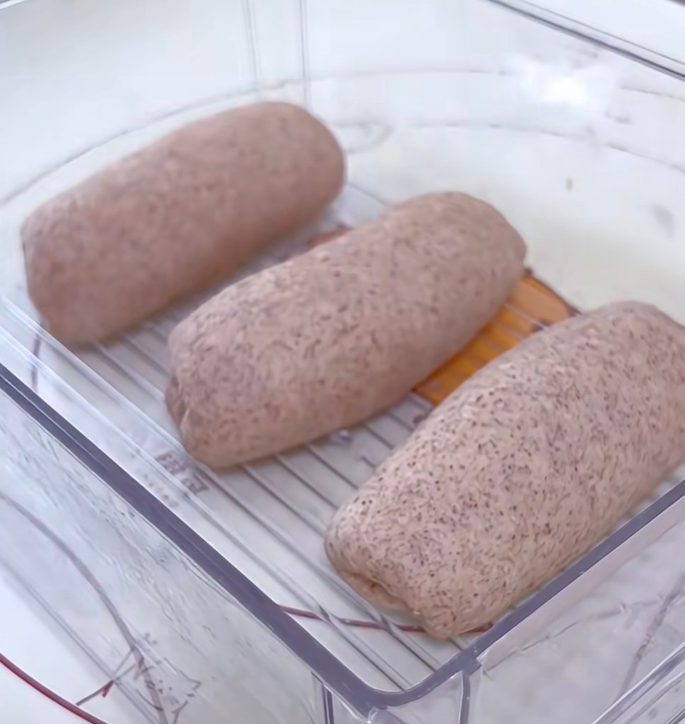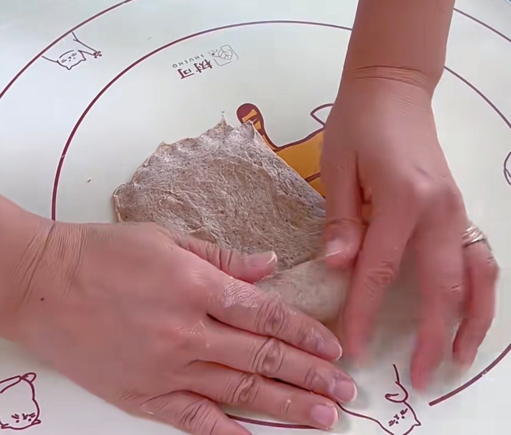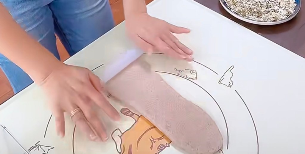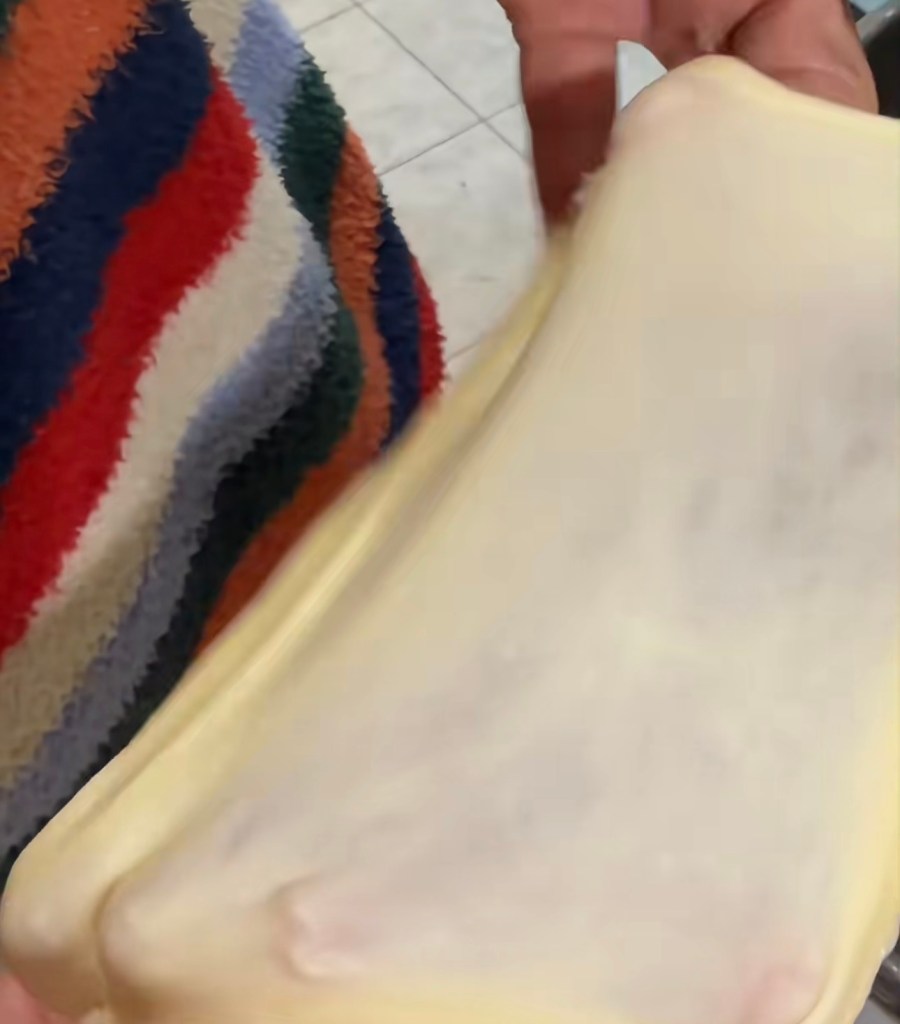 6. the 2nd shape – the same skill。 Flatten the dough. Flip the dough piece with smooth side facing down. Use rolling pin to make it a long and thin piece – the width should not bigger than the width of your toast box.
