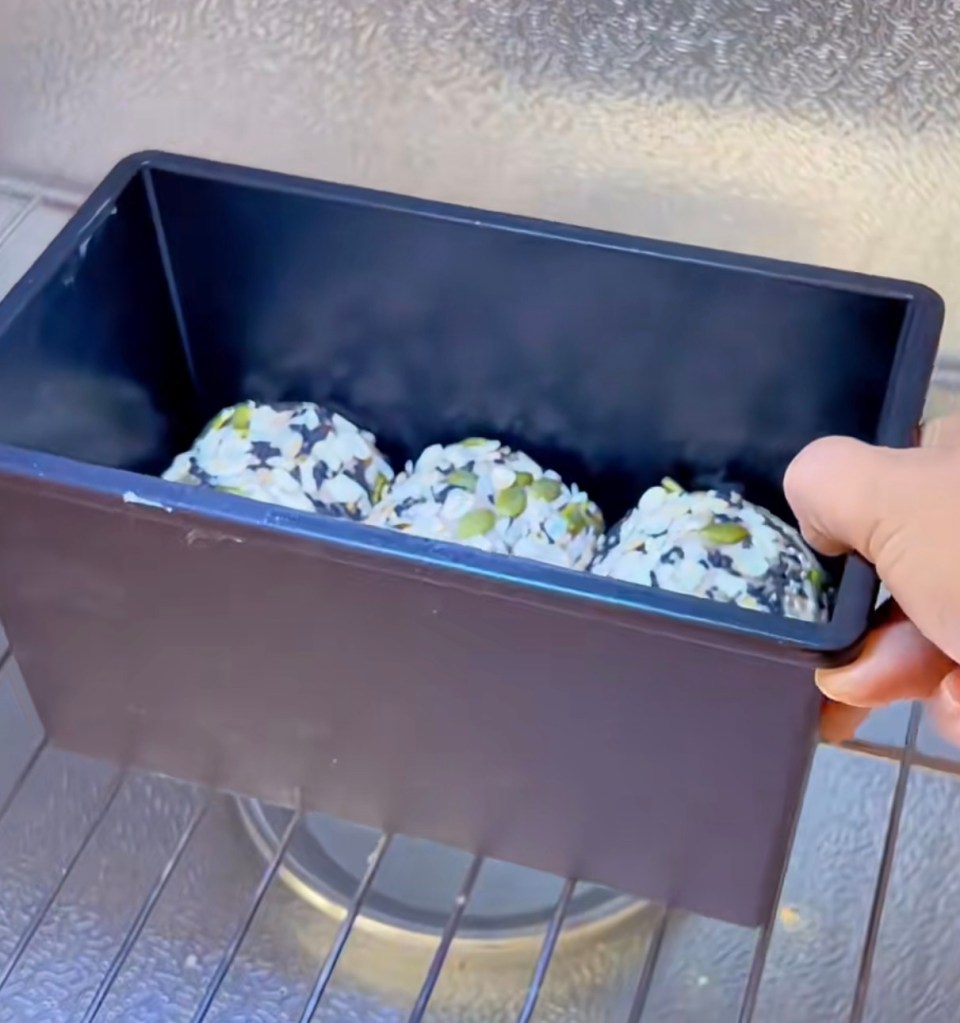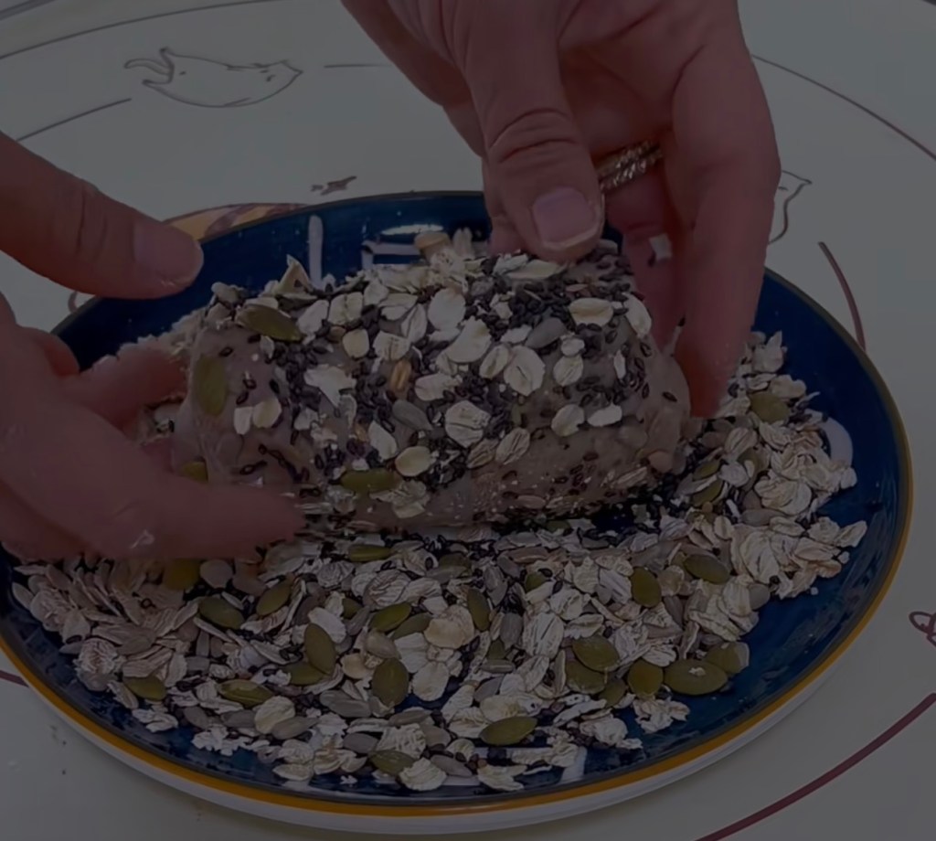 7. Spray with water. Roll each piece in a plate of granola or oatmeal and pumpkin seeds mix or anything you prefer. place them in the toast box.