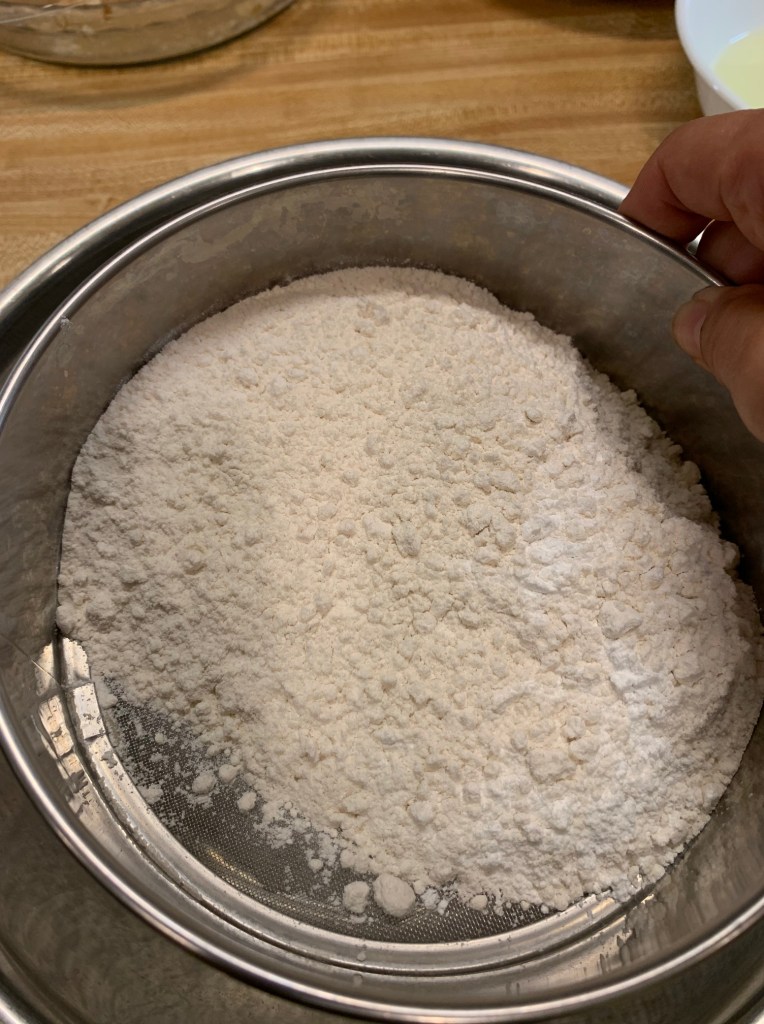 Combine 150g all purpose flour, 1¼ tsp of baking powder and ⅛ tsp fine salt, sift the flour mixture twice to incorporate and distribute the salt and baking powder evenly. Place walnuts in a plastic bag and use a rolling pin to crush them into small bits. Pan roast the walnut bits with a dry pan over medium heat. Stir constantly with a spatula until fragrant or lightly brown. This recipe uses small amount of walnut, it should take about 2-3 minutes of toasting, set aside to cool.