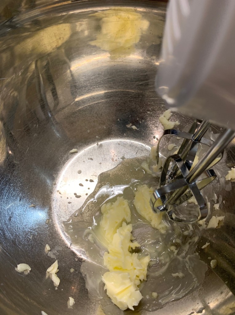 Place 40g softened salted butter in a deep mixing bowl. Turn your electric beater into the slowest mode and beat the butter. Gradually add the 100g sugar and keep beating. Then add 30g cooking oil and 40g eggs. Keeping beating and mixing. The mixture will become fluffy and light. The whole process takes about 2-3 minutes.