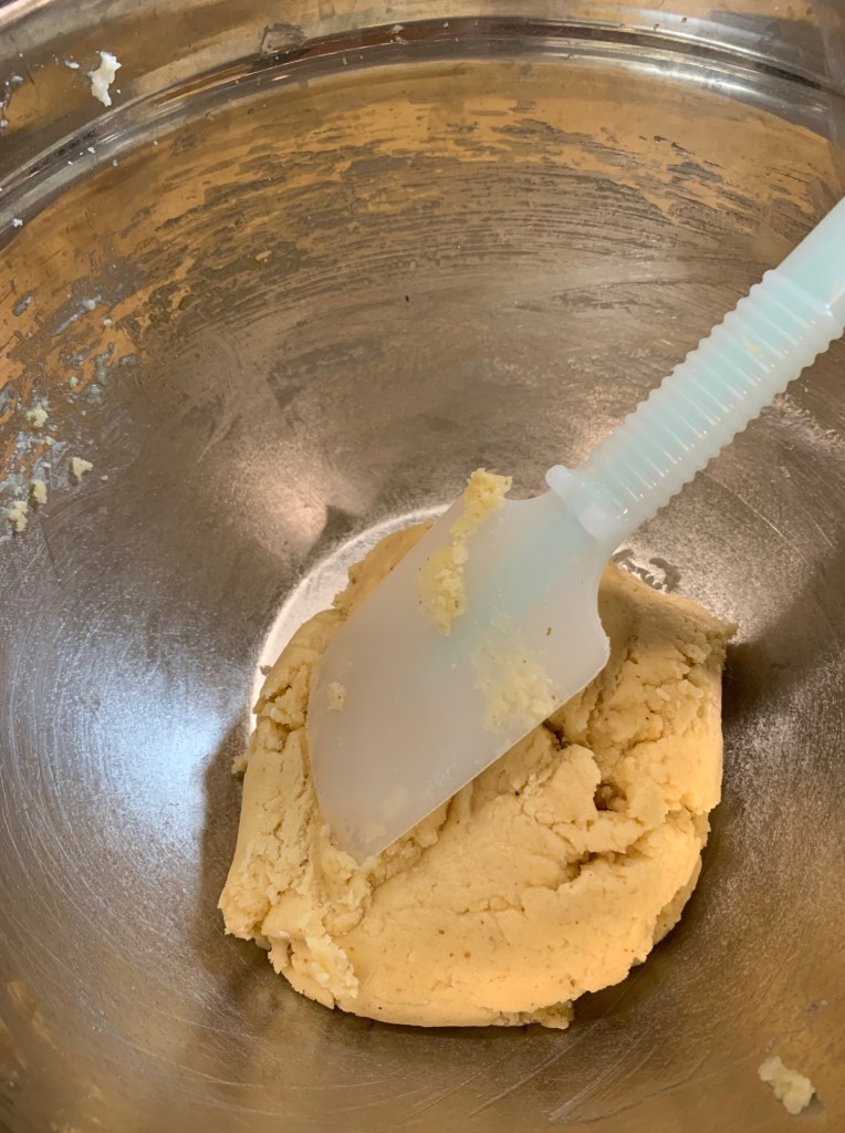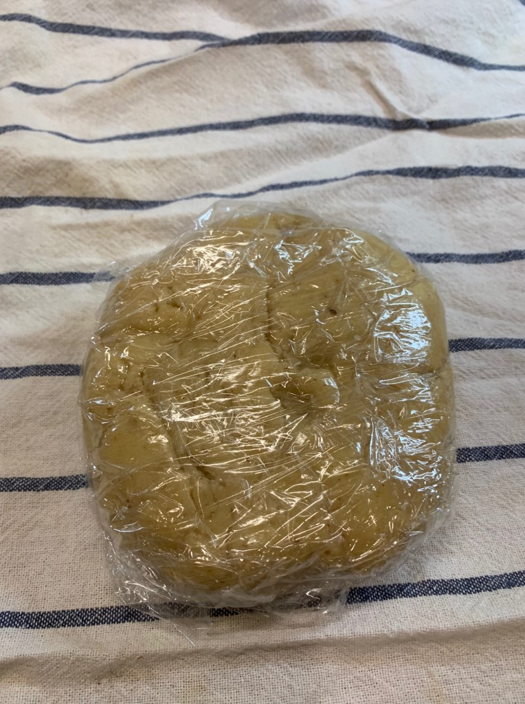 Mix in dry ingredients, fold with a spatula until dough forms. Wrap the cookie dough with cling wrap and rest for 15 minutes.