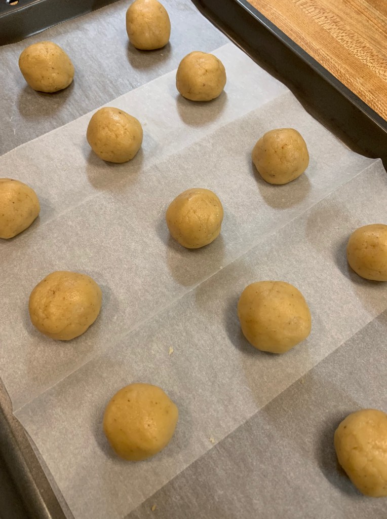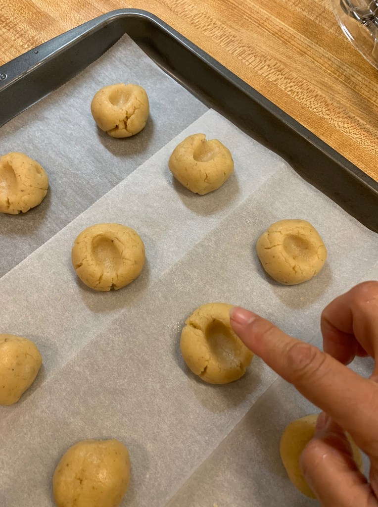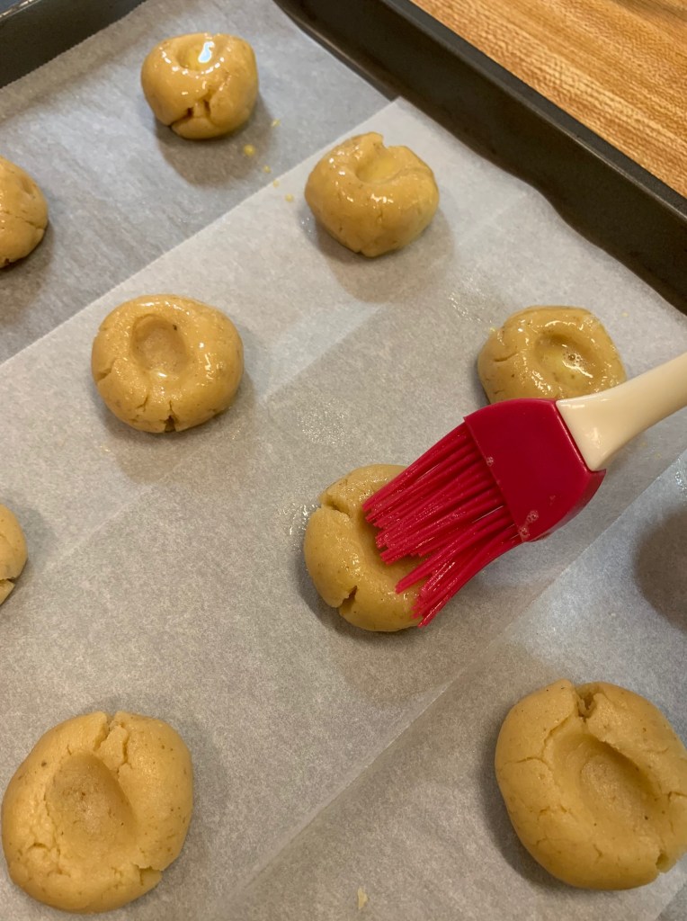 Cookie dough is about 400g, Divide into 15 portions with 26g each, arrange on a baking tray lined with parchment paper. Roll each dough into ball-shaped and flatten slightly, press the cookies dough with your thumb to create a hollow center. Brush with egg wash.
