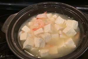 Tofu and Shrimp Casserole in Chicken Broth鲜虾豆腐煲xiān xiā dòu fǔ bāo