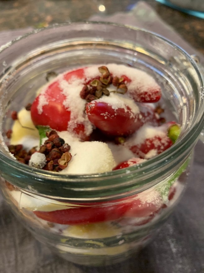 - Get 1 canning jar, place one layer of red chili pepper and ginger, followed by another one layer of salt. Then sprinkle some Sichuan peppercorns on top of the salt. Repeat the process until all ingredients are used up. Pour the cooled water to the pickle jar. All your ingredients should be soaked in the water. Cover the lid.