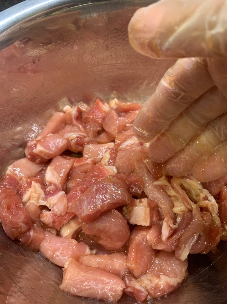- Clean the pork, cut into long strips and put in to a mixing bowl. Add all the seasoning ingredients except 1 tablespoon of cooking oil. Use your hand to ‘massage’ all the pork strips to ensure seasonings are well absorbed. Toss in 1 tablespoon of cooking oil. Mix well. If done properly, you will not see any liquid left on the bottom of your mixing bowl. Marinate for 20 minutes.