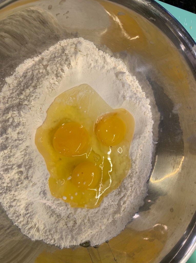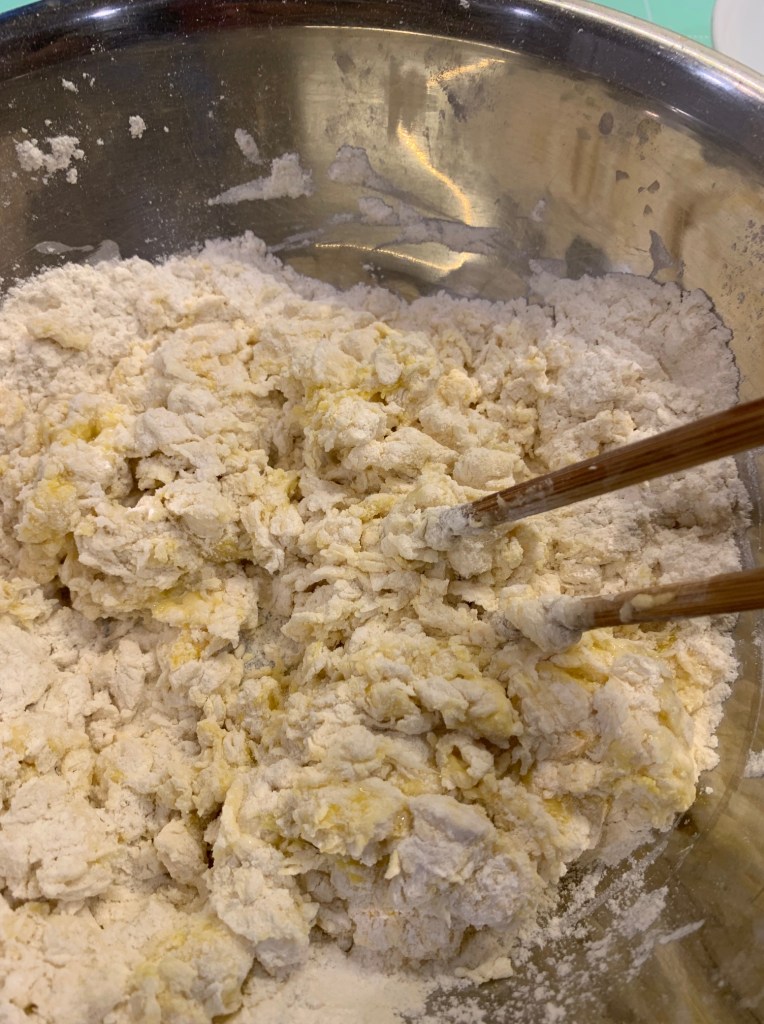 - In a large bowl, add flour and eggs. Use chopsticks to mix the flour.