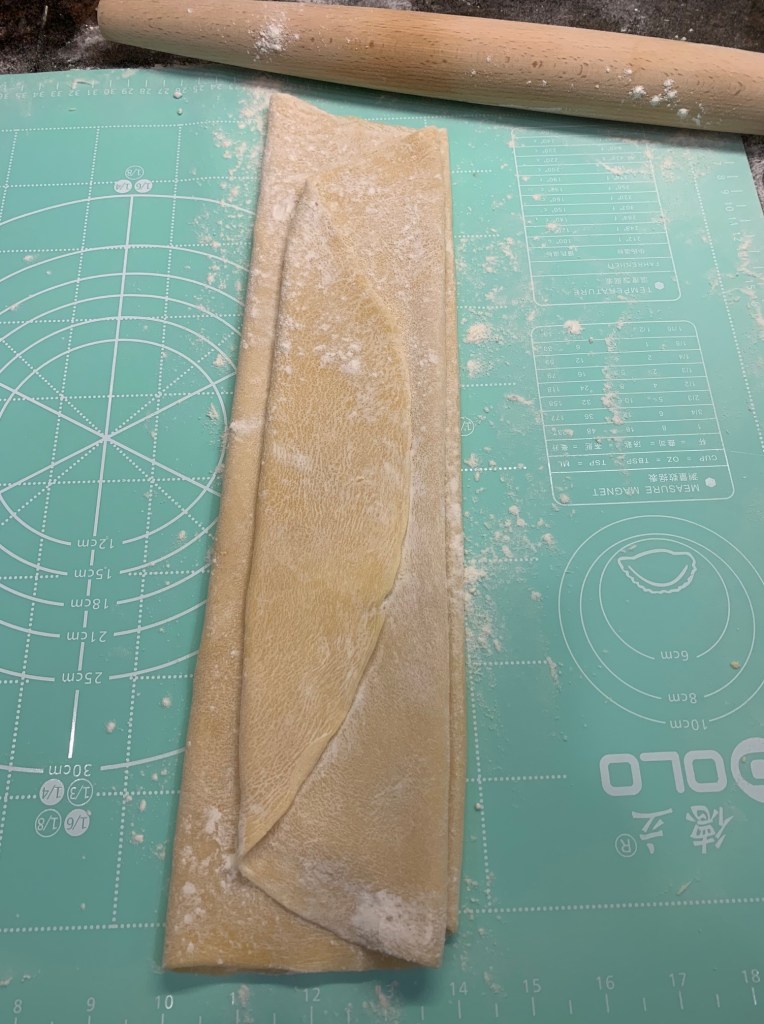 4. Fold the sheet (for easy cutting), dust between the layers to avoid sticking. Use a knife to slice the layers of dough whichever width you wish.