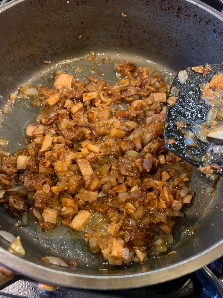 2. Heat oil in a frying pan. fry the minced shallot over medium-high heat until aromatic. Add the minced onion and cook until soft and translucent, followed by the diced char siu. Stir in the char siu sauce with the water. Cook until it starts to boil. Add the thickening and cook to your preferred consistency. Transfer to a large bowl and let it cool down. Set aside.