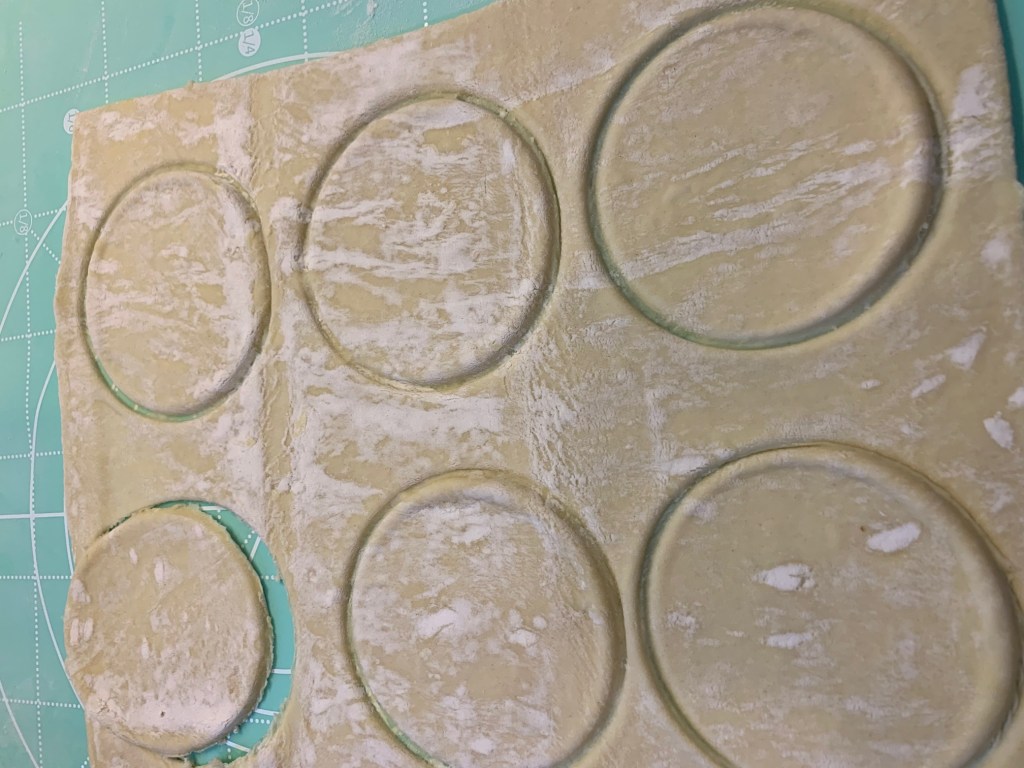 3. Preheat oven to 400F / 200C. In the meantime, lightly sprinkle flour on a clean surface. Roll out the puff pastry into a 32cm x 22cm (12.5inch x 8. 5inch) rectangle sheet with a rolling pin. Use a 10-cm (4-inch) cookie cutter (or use any round shape plate or bowl available in your kitchen) to trim out 6 circles.