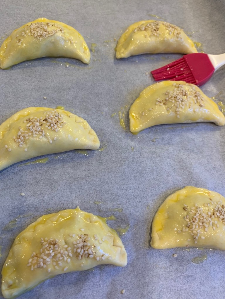They can be found at any dim sum restaurant. This China southern style puff pastry is folded around the sweet and meaty filling, brushed with an egg wash, and sprinkled with sesame seeds. Can be oblong or crescent shaped.