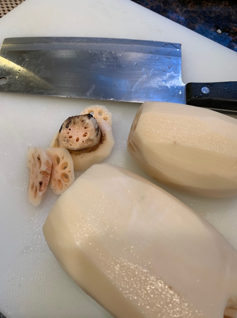 4. While the meat is cooking and almost done, peel and clean the lotus roots. Trim the ends and roll cut them into pieces in inch wide. If you notice any mud at all inside the roots, wash it off carefully.