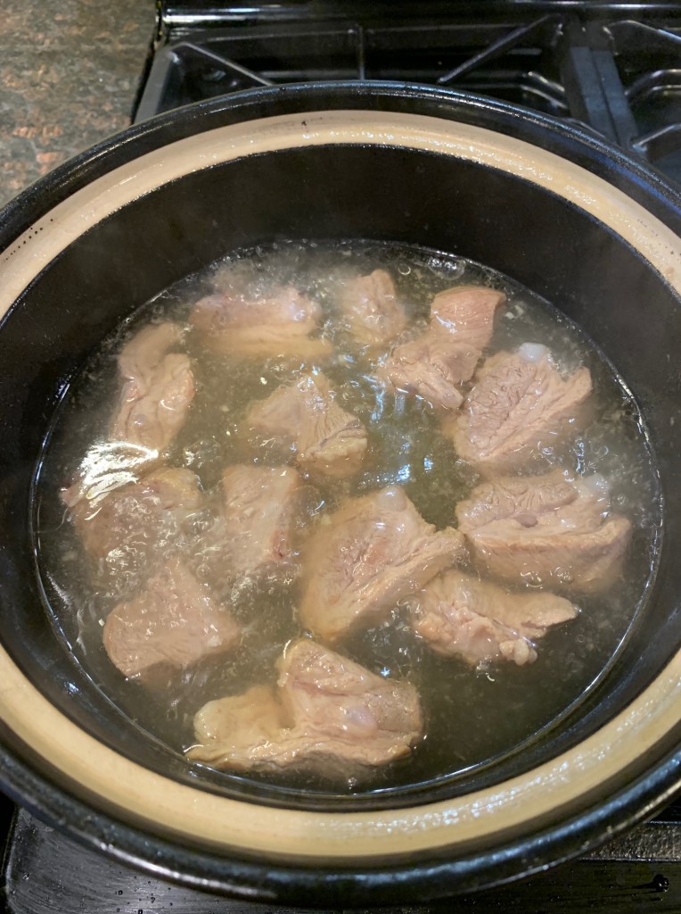3. Cover the ribs with water. Bring the pot to a boil. Lower the heat to a gentle simmer. Cover the pot with lid. Cook for about 1 hour until the meat is very tender.