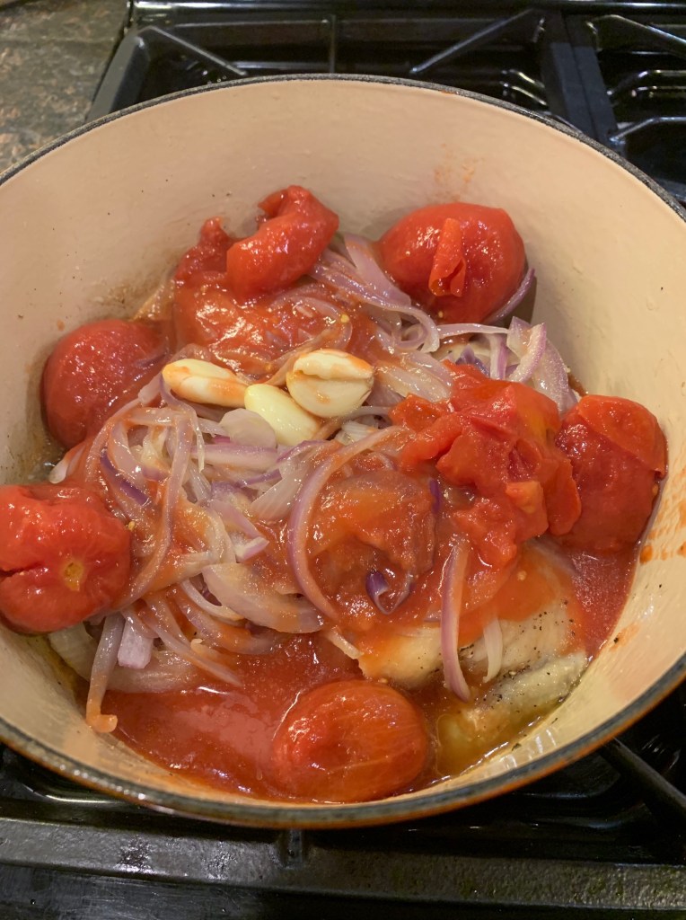 2. Increase the heat to medium. Add the chicken and cook for 6-8 minutes to brown both sides. Return the onions to the pot. Pour in the wine and cook until it has reduced by half. Stir in chopped tomatoes. Add chopped garlic. Lower the heat. Cover the pot. Cook for about 30 minutes.
