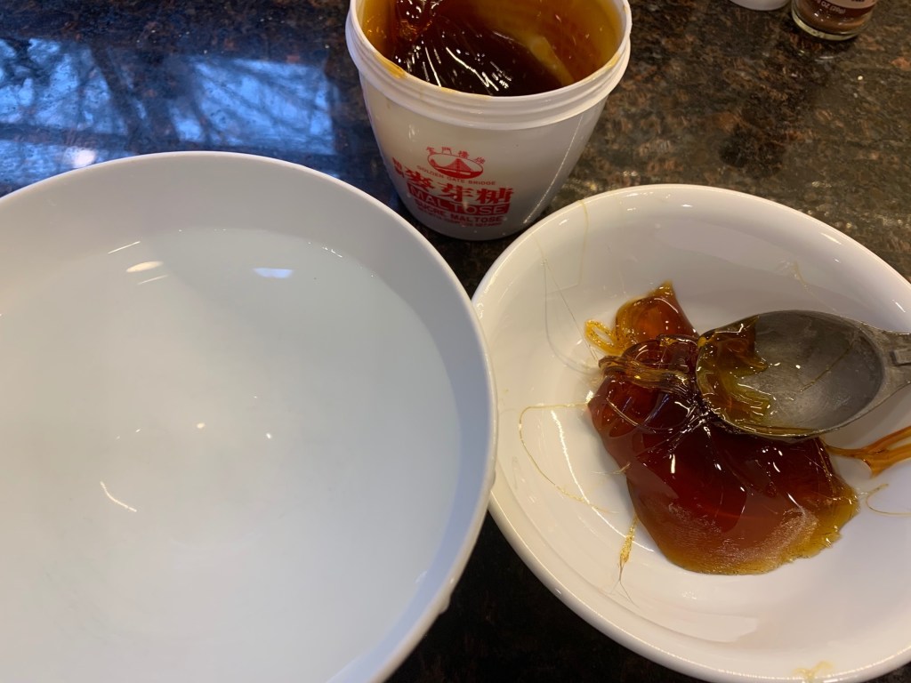 You will need to have one particular ingredient, maltose麦芽糖, help achieve the gorgeous skin color. Maltose is a very thick liquid sugar made from sprouted grains such as barley. It is less sweet than corn syrup but much sticker and firmer. It is used widely in Chinese disserts and sweets. It is available in small plastic tubs in Chinese grocery stores or Amazon. Maltose must be heated before it can be scooped into measuring spoons. This can be done in the microwave on low power in short bursts, or by placing the tub in a bowl of hot water.