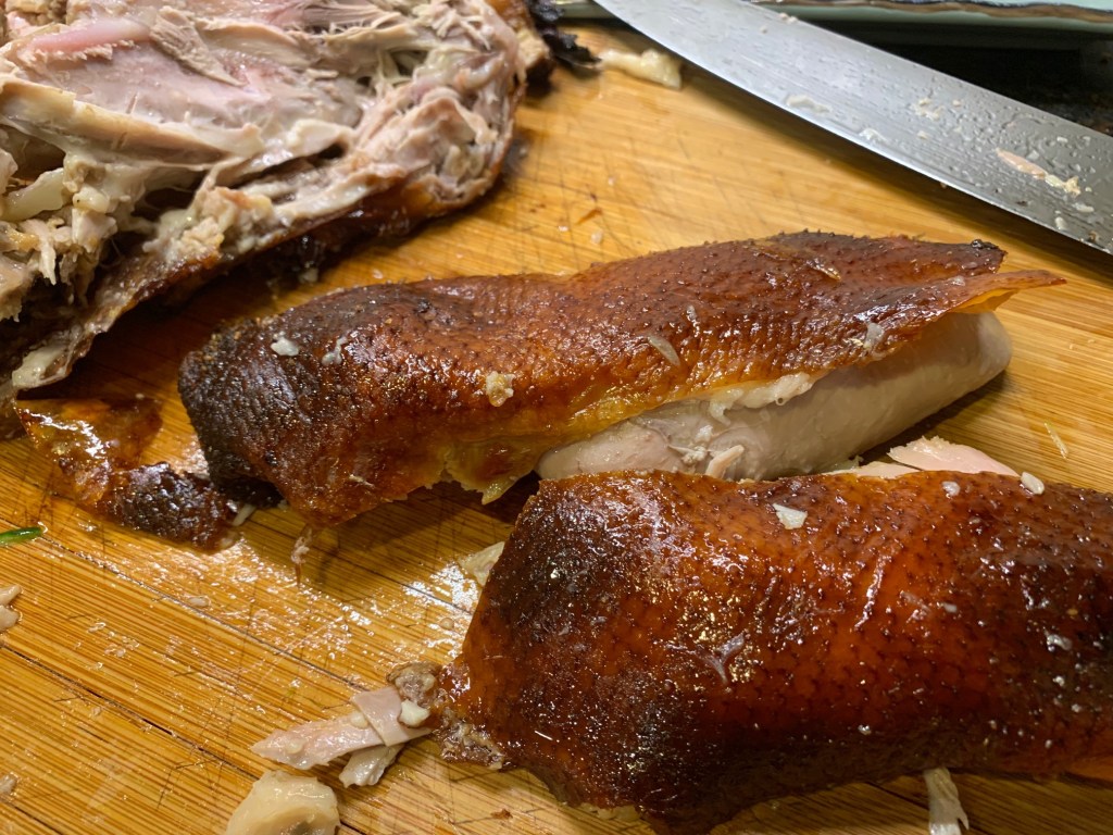 5. Heat up the oven to 360F°/180C°. In the meantime, carefully remove the roasting pan from the oven – the pan is hot so not to burn yourself. Use a spoon or fork to remove the bread from the duck. Remove the aluminum foil from the legs – but still leave the wings and bones part of legs. Place the roasting pan back to the oven – depending how deep the skin color looks like now. To prevent the skins from darkening, you can tent the duck again with aluminum foil. Bake in the oven for 30 to 45 minutes.