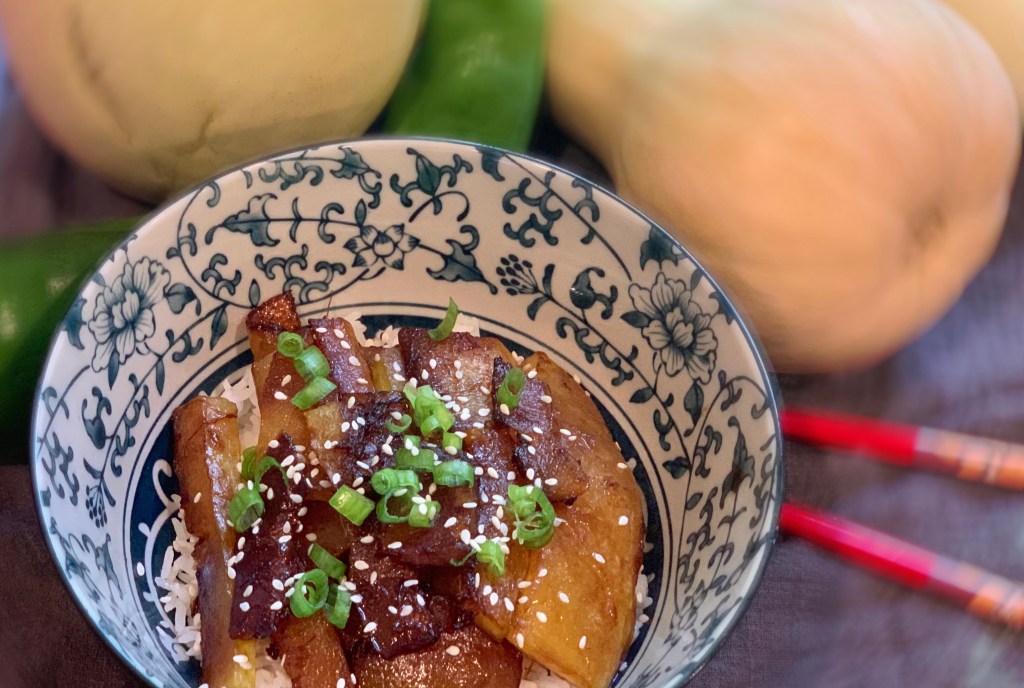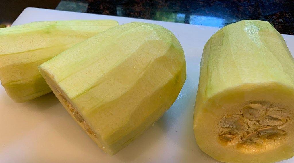 A friend gave me a beautiful squash harvested from her garden yesterday. I thought it was a type of snappy and watery summer squash or just a giant zucchini. It is still summer, isn’t it? While doing research on how to cook it, I found it actually belongs to the winter squash family. I then removed the thick and tough rind. I also precook the flesh in microwave to help soften the flesh. If summer squash, such as zucchini, is used, you can skip the ‘peeling’ and ‘microwave’ steps.