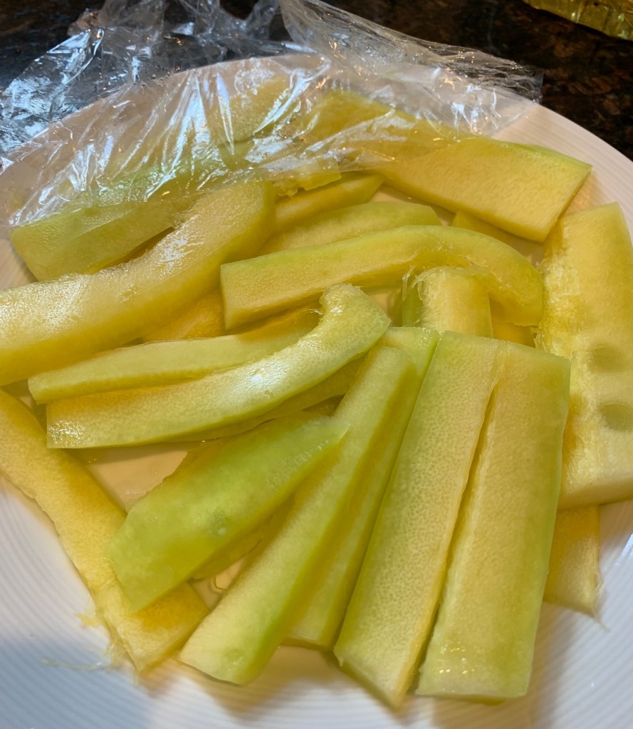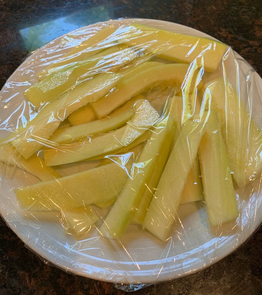 2. Place all the squash pieces flat in a plate, cover the plate with cling film then microwave over high heat for 2-3 minutes till softened.