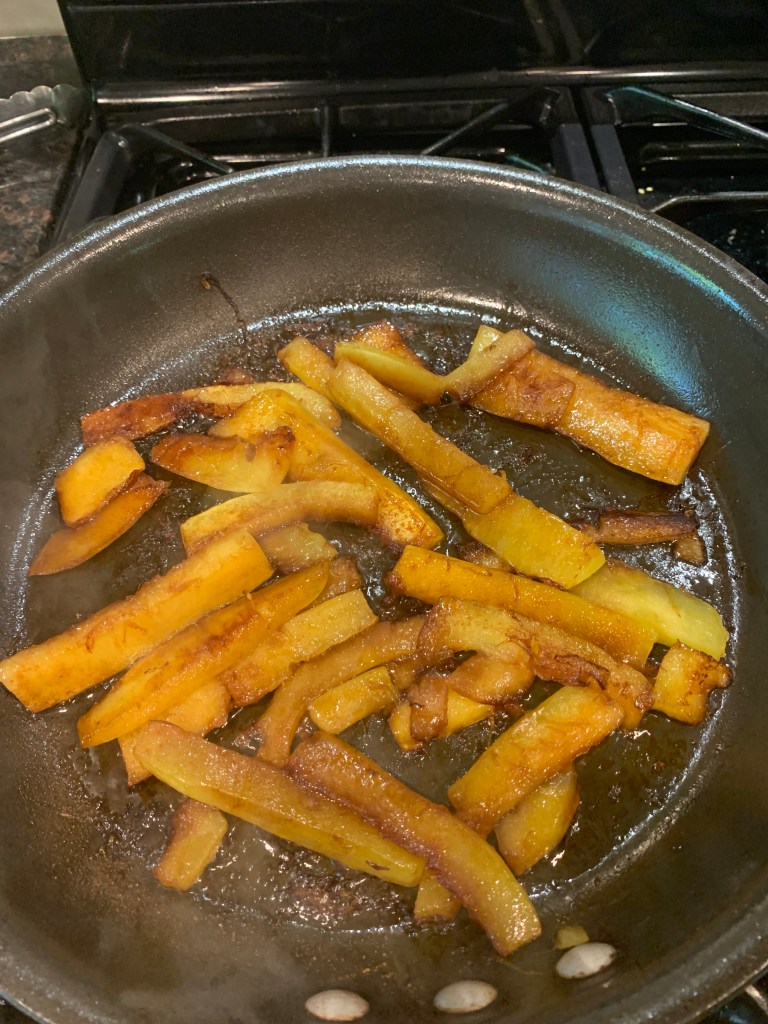 4. Add two 2 tablespoons of cooking oil in a frying pan over medium high heat. When the oil is hot, place into the squash pieces, pan fry for 3-4 minutes till golden, flip the pieces to fry the other side. Pour into the seasoning sauce evenly onto the squash pieces. Cook for another 2-3 minutes until seasoning sauce well absorbed by the squash. Turn off the heat.